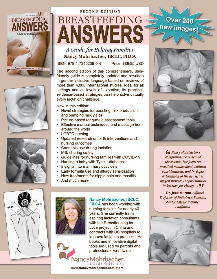 Breastfeeding Answers: A Guide for Helping Families, Second Edition by Nancy Mohrbacher, IBCLC, FILCA is the definitive reference for lactation specialists. Packed with effective strategies for solving virtually every lactation challenge, its evidence-based approaches are supported by reviews of more than 4,000 studies. Its comprehensive index and user-friendly, two-column format make finding answers easy.